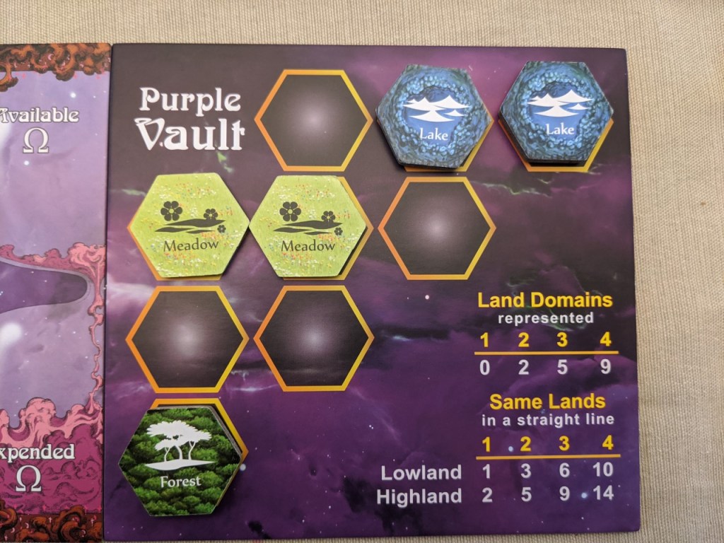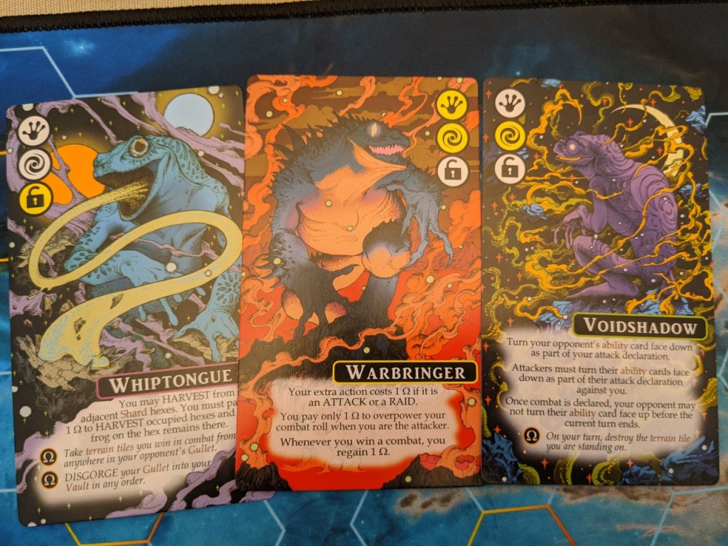 Represented by a surprisingly detailed toad miniature, players take turns hopping about the oddly shaped board and spending actions to devour the very ground they stand on. The surface of the shard – a tangible concentration of “aeth” – is dotted in different types of geography such as swamps and mountains. The variations matter solely because they form different vectors to score victory points and encourage various arrangements in your vault. Primarily they drive players to different areas of interest on the map and cause natural collisions as you fight for dominance.