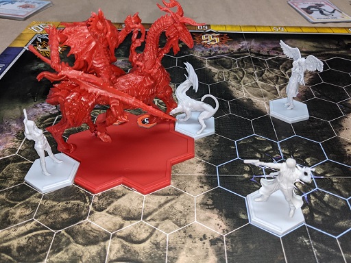 There are two elements to this game which stand out. The first is the use of gods. Each player takes on the role of one of four included cosmic deities, wielding an asymmetrical deck and an impressively large miniature. Unlike titles such as Cthulhu Wars or Rising Sun, the preternatural plastic here do not directly get involved in the battles that take place. They move about the edges of territories, occupying intersections between areas, and then can influence play through their personal cards.