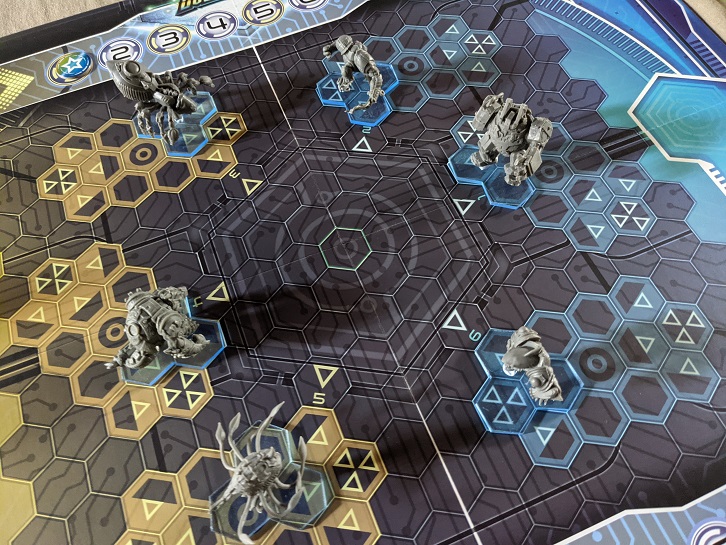 Invade also frames the tight action economy in its best light. In OverDrive you do not activate characters uniformly each round. It is indeed an alternating activation system similar to Necromunda or Deadzone, but each player receives four total activation tokens. On your turn you can assign one of these to a character to activate it, but each character may only receive two such tokens per round. So this results in a lopsided set of activations where you can’t exercise strategy with symmetry. Certain portions of the field will receive less attention and where you place your limited attention is shaped by both your character abilities as well as the type of matchup.
