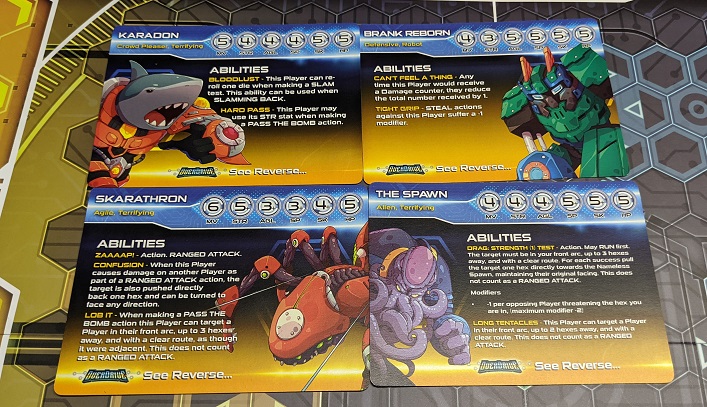 The mix of characters is strong in terms of their diversity and does in fact allow for you to play a full game, but you will find yourself yearning for more not long into your season. The strain lies in match setup. You bring six different options to the table to form a pool. Players then alternate selecting a character like some twisted high stakes game of playground Red Rover. This is a delightful quality to the design as identifying synergies and working to exploit them forms the emergent depth, particularly over multiple plays as your experience grows. Variety in this regard also mirrors the zaniness of the various modes of play and enhances the richness of the system.