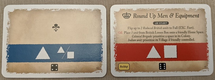 The decks these activation cards are drawn from are asymmetrical. The French selection seems to favor irregulars and often boasts higher initiative values. The British cards are biased towards royal brigades and heavier impact. These are communicated via symbols that match the shape of their respective infantry. You will pick this up quickly. Certainly quicker than General Braddock.