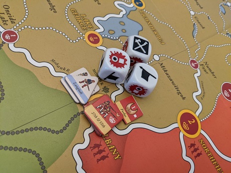 The board’s point-to-point movement results in some interesting maneuvering due to limited approaches to certain cities. Additionally, some pathways are only accessible by light units which adds even greater emphasis on force type. The one aggravation I have with this aspect of the game is that the names of settlements and their point value are often obscured by troops on the space. It’s an annoying quality that can slow play in an otherwise very functional and beautified presentation.