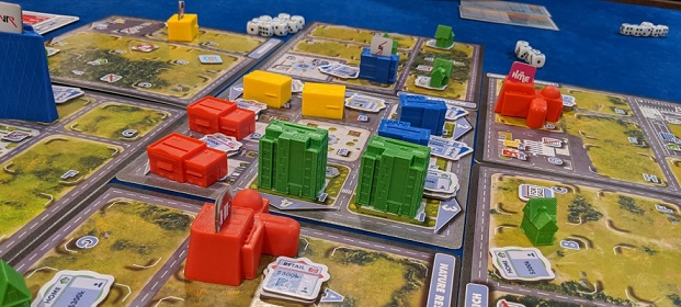 Magnate is a medium weight game. It’s not terribly complex and it scoots along without hesitation. The bulk of your time is spent in snatching up plots of land and then building properties upon them. These developed landscapes attract tenants and start generating rental income.