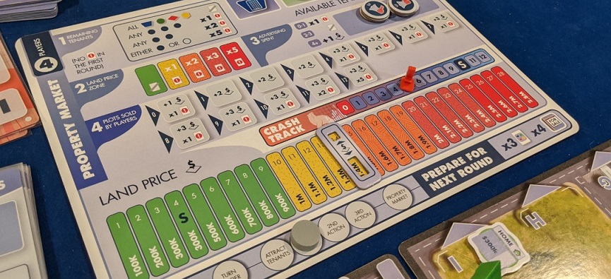 You can feel the game building towards the finale. As the property track ratchets up the parallel crash marker trundles downward. Its pace is controlled by a deck of cards which provide variance and obscure the precise moment it all starts tumbling.