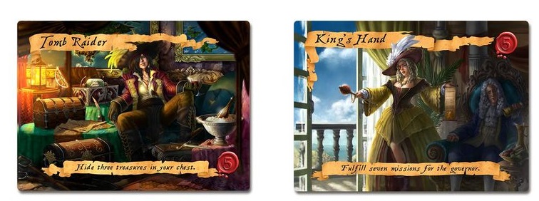 Delivering goods – the usual rum, tobacco, and sugar – is perhaps the most pedestrian task, but it’s punched up by the very cute physical ship miniatures. These multi-part figures are expandable as you can add new hull pieces, attach additional sails, and insert cannons. The goods themselves are represented by little discs on the deck of the ship and all of these upgrades serve as a clever sense of physical representation. It’s also easy enough for a player to take a gander at your miniature and know exactly what you’re capable of, allowing them a brief moment to weigh their options and consider a raid.