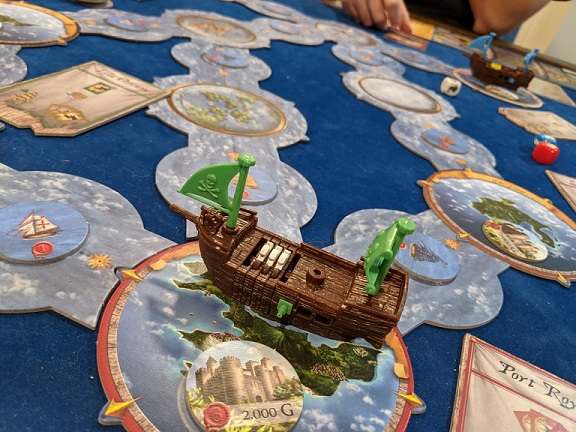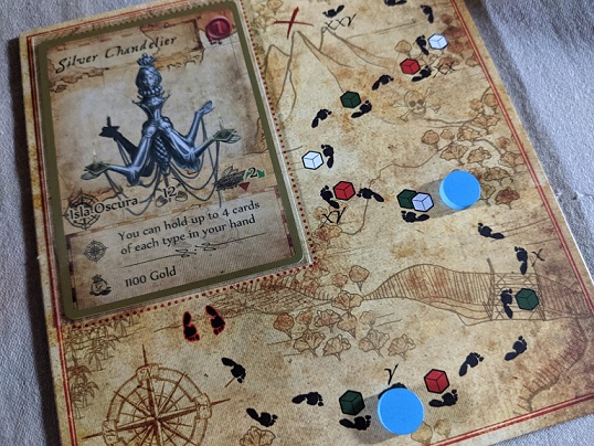 The buried treasure mechanism is also a treat. After hitting up a port and discovering a rumor for a buried artifact, you then head to the island where it’s supposedly located and begin your expedition. This has your main ship sitting listlessly at the isle, while you spend your action points each round pushing a cube down a track on a little treasure map. After a couple of turns you arrive at the destination and receive the item – perhaps a special sword or maybe even a missing dog companion. It’s light with few broad tactical considerations, but it’s neat.