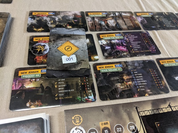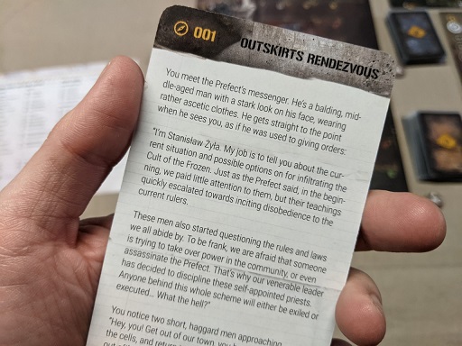 The other half of Hunters is the choice meat. It’s travelling between locations – represented by tarot-sized cards – and triggering story events. There is a huge amount of story, all of it annotated not in a big book, but rather across a couple hundred more cards. This combines and plays off those zoomed-in fight scenes pretty well from a tempo perspective. There’s a very nice duality that works to break up routine and push the throttle.