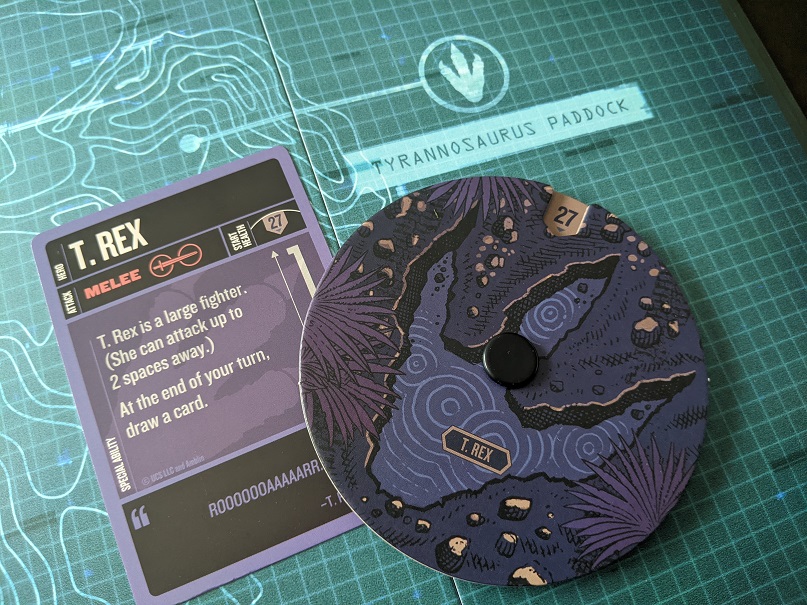 Partially, it’s a problem of appearances. The T-Rex character dominates the stage, taking up a lot of the figurative space in any matchup. You could describe it as a faux boss battle. With such a huge health dial and the oversized miniature taking up two spaces on the board, it’s a physically impressive and dominant feature.