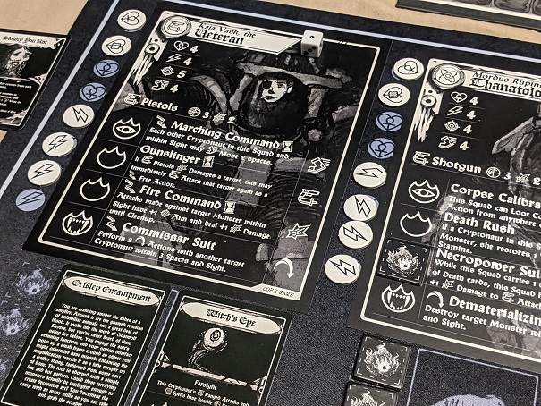 Finally, you have over 30 Cryptonauts to build your squads. If playing with the ideal player count of three, two players will each build a squad of three characters. This is not similar to Zombicide or those other faffy games that couldn’t be bothered to scale properly. Here, it’s a feature as each character has multiple special abilities you unlock through play, and they often combo with other Cryptonauts allowing you to create squads of well-oiled demonic killing machines. Finding these emergent synergies is a significant factor and it’s truly rewarding to see your theorized potency materialize in this fictitious reality.