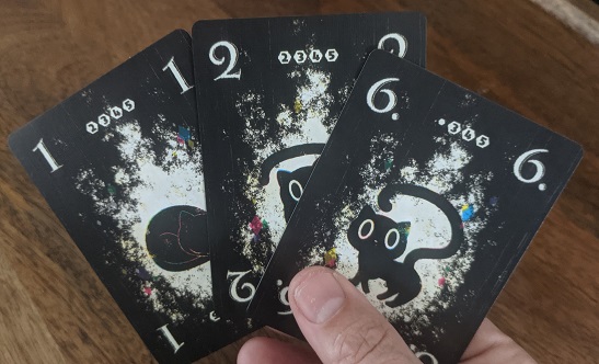 What’s fascinating with Cat in the Box is that it applies concepts of quantum mechanics to this classic style of card game. When you play a card, you decide what suit it is when you place it on the table. By themselves, these cards consist only of numbers, sitting in a suspended quantum state waiting to be ovserved.