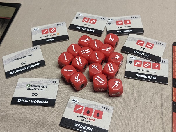 This is actually significantly different than its predecessor. In Vengeance, the dice rolling happened as part of the action. You rolled and resolved maneuvers, such as punches or gunfire, one at a time while a sand-timer provided pressure. In Roll & Fight, the maneuvers themselves are constructed in real-time but they’re not resolved until this rapid action phase is complete.