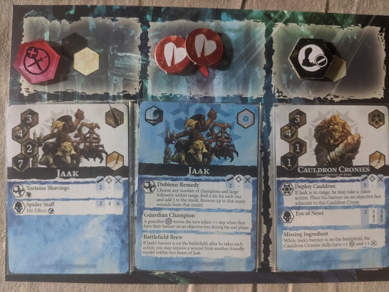 Before closing, I also wanted to touch on one of the newest Godtear champions, Jaak. This oddball goblin is a “dubious alchemist” who is flanked by his obedient crew of laborers. They haul his cauldron, potions, and medicines. The most interesting effect is that Jaak can deploy his banner – thematically a cauldron – on an objective hex adjacent to his cronies. This additionally buffs the minions too, centering Jaak’s strategy around deploying and defending his cauldron strategically. That is unsurprising given his status as a Guardian-type champion.