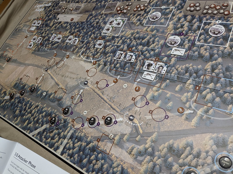 Part of that expansive feeling is a foundation built atop a layer of historical literature. There was a tremendous effort here in researching the battle of Lanzerath ridge and integrating the details and story into a coherent and multi-layered design. The rulebook includes a number of references as well as detailed writing illuminating what occurred between a small group of American soldiers and the encroaching SS Panzer Division on the first day of the Ardennes Offensive. There is even a companion book you can purchase or download for free that farther enrichens the experience and widens its breadth.