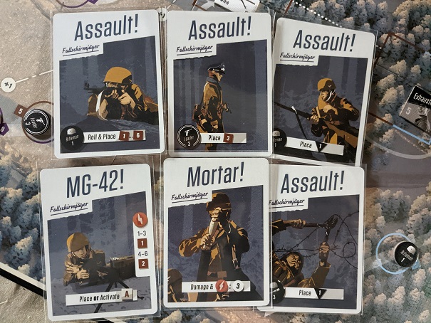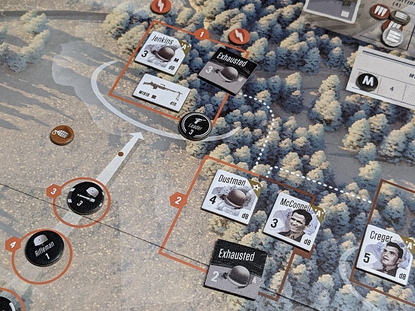 Enemies can push unexpectedly fast towards the treeline. You have some idea on how much distance they still need to cover and how long this will take, but the randomness of your firing actions and where foes will pressure can leave you suddenly overwhelmed. You will spend a great deal of effort preparing for this, setting up defenders to repel the invaders and keeping your options open. If one adversary makes it into your defensive position and remains into the next round, you lose outright. I’ve had plays where everything was going extremely well. I could envision the little smirk on First Lieutenant Bouck’s face. Then the unthinkable happened and the line collapsed. It was tragic.