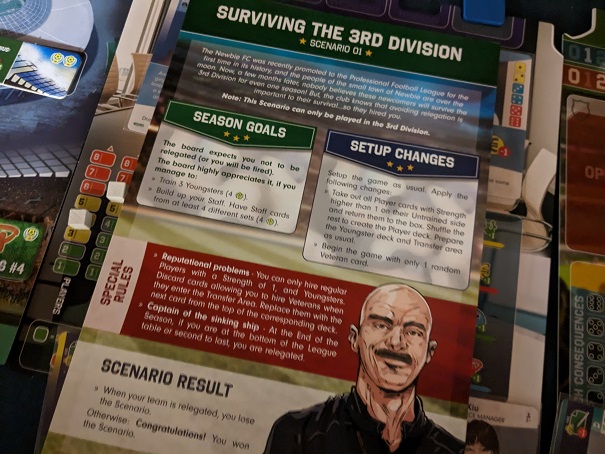 Much like Robinson Crusoe, Eleven offers several scenarios with tailored narrative and mechanical setups. This includes situations such as fielding a weak team of youngsters while trying to avoid relegation. Or competing head-to-head against a specific rival club. This format is superb. The scenario offers a framework to contextualize play and it ties together a greater story. It’s as if you’re playing through a season of Ted Lasso and it works admirably. It’s unfortunate that these scenarios don’t apply to multiplayer sessions, but it’s the clear indicator that Eleven is best experienced as a game for one.