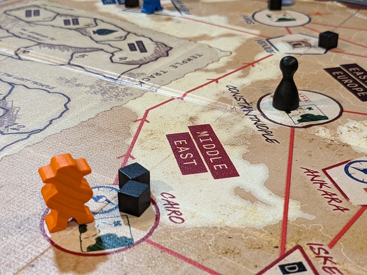 But let’s begin with the first half. Roughly 30 minutes of this hour-long expedition is spent traversing a map to visit key locations in Europe and the Middle East. Players are looking to decipher clues, question key individuals, and uncover hidden truths. This really carries Tobago vibes. That 2009 Bruce Allen design had players driving around an island and unraveling the mystery of hidden treasures. You did this by learning clues such as the treasure is on a jungle space, or within a certain distance from a landmark. It was neat and clever, and it’s still a relevant design today.