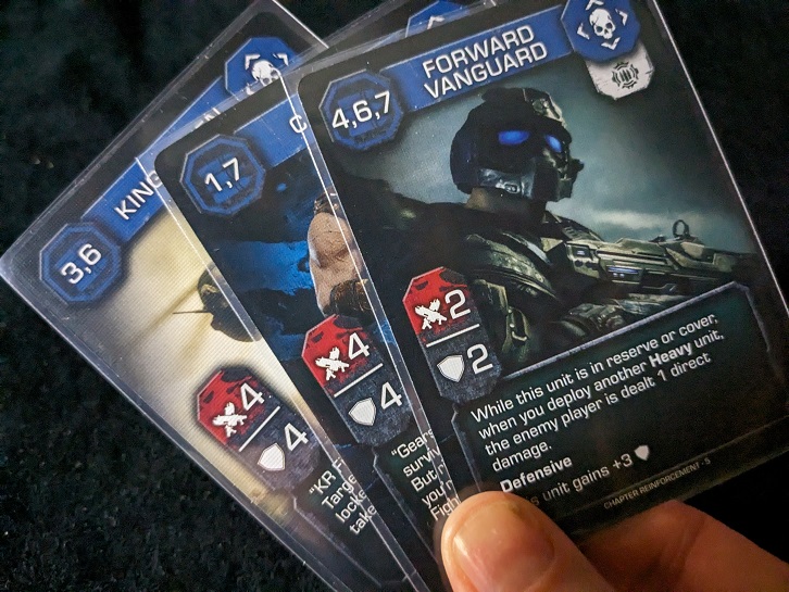 While not an exciting mechanism, this hand and deck management is a tense one. Every game I’ve found myself grunting or contorting my face in disgust as I decide between spending my precious actions drawing cards to deploy a heavy hitter, versus just winging it with a lighter unit option. Sometimes you will find yourself poised to deploy something outrageous, like an armored vehicle, but then you toss out a reaction card in order to save one of your targeted soldiers and no longer have the correct number of cards in hand. There is also a pleasant volatility in that you can draw up the cards that are torn from your deck when it’s attacked, providing for a big fell swoop of options in one go. Drawing too many, however, can really cause a logjam and tie you up in a logistics nightmare. This system doesn’t particularly model the core concepts of the Gears of War spirit, but it’s a compelling tactical challenge in its own right, one that is a pleasure to fiddle with.
