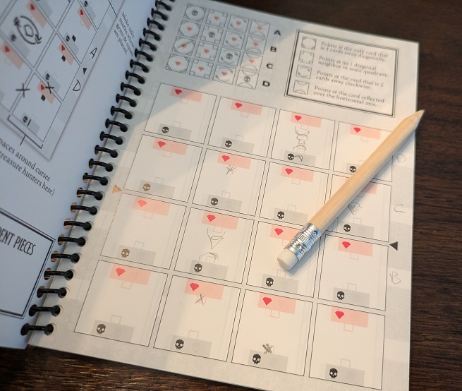 As you can imagine, there’s this core intersection of several different concepts. Deduction via ascertaining which cards are worth points and which are perilous, placing down treasure hunters in a bid for holding the space, and then surrounding and controlling the treasure rooms with multiple sets of your pieces to siphon the most points.
