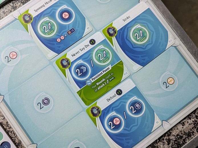 What’s promising about this system is that it harnesses the momentum of engine-building Euro-games to fuel action on the table. Character potential grows with each successive card and the impact of each turn builds upon the last. Eventually you fill a row or column and the contents are discarded in a flurry of activity. This creates a cyclical feeling of powering up to unleash fury, an emotional and physical outburst reminiscent of fighting games and the super bar.
