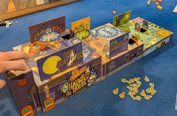 This is the real challenge of Boxtop Pinball: Haunted House. It’s a cheap product, made to hit a low MSRP as the gameplay appeals to a broad market and not simply hobbyists. It may take a cue from Tumblin-Dice, but no one’s going to stumble across that previous game’s huge box in a mainstream store and pluck it from the shelf on impulse. This new entry is affordable because it’s intended to be played and used up by an audience that doesn’t spend hundreds of dollars on games each month. Components will get dinged and bent, and it likely won’t hold together for a dozen years. This isn’t an artifact, it’s a product for entertainment and leisure, one that’s intended to be a distraction from the suffering of everyday life, nothing more.