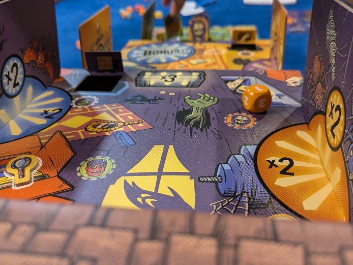 There is a fresh variety in scoring considerations here. While it has the straightforward method of rolling high and shooting for specific areas, it also has a couple other point vectors that liven things up. Monster standees provide obstacles to the tossing process, but they also award points. Incentives are such that the more unique monsters you collide with in a given round the more you score. Another slick cut is the clue token arrangement. These facedown magnifying glass chits are claimed if you disturb them, even if they just shift a millimeter or so. On the back is a number of points you gain at game’s end. This effectively adds an element of hidden scoring which helps create uncertainty and maintain hope for those at the bottom rung. I find this aspect particularly interesting, even if it adds a possible sore point due to the extremely swingy values on the clue tokens.