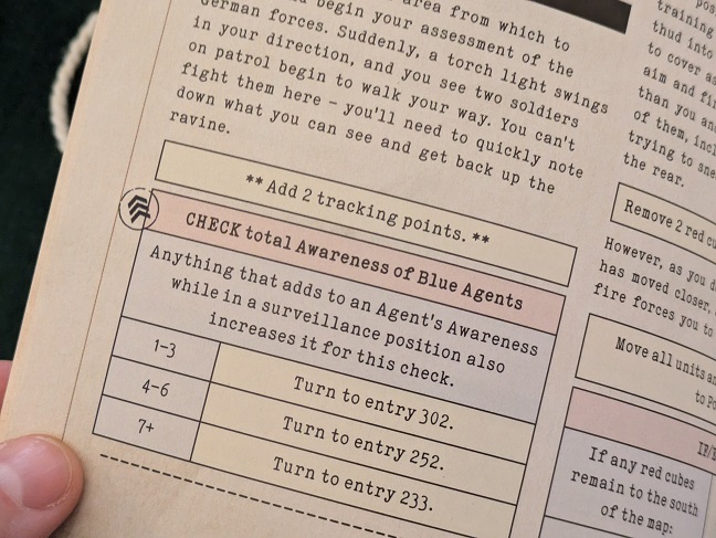 While the set-pieces and tactical battles are the best part, the supporting resolution system is a major contributor. Instead of dice or randomized outcomes, War Story presents tiered skill checks. When you want to perform a task, it will offer several thresholds for a skill and then tell you which entry to flip to. So, if you’re trying to persuade a local to offer you shelter, it will ask what your character’s Influence is. If it’s 1, flip to entry 193. If it’s 2-3, then go to 211. And if it’s 4+, then go to 344.