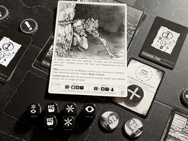 With The Last of Us you need to setup a whole lot more. This is primarily a function of the board and needing to create atomized mini decks instead of one larger shared encounter pool, but it takes several minutes to organize on the table as well as to return to the box when you’re finished. Play, similarly, is extended and nearly double the time requirement of those previous games. A particularly long session with multiple players could stretch to a full two hours. That’s somewhat rare, but it’s a real possibility.