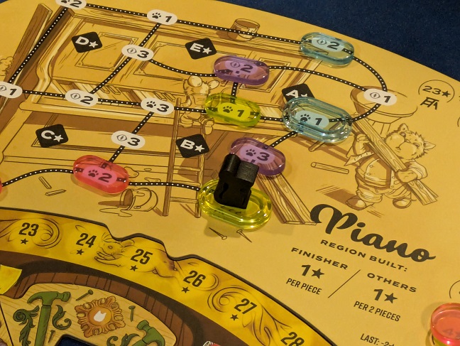 A few surprisingly fiddly details don’t aid the effort. The dice system for instance is not as elegant as it ought to be. You select a die in one of the rondels and pick it up from the cardboard frame, placing it on an adjacent space. This indicates which color cat resource the player that owns the die receives. This intermingling of ownership is a nice touch, as you can utilize other player’s dice to achieve the desired action. Of course this comes at the cost of greasing their resource wheels, but sometimes it’s worth it. After placing the die adjacent to its starting position, you spend the action points shown on the die to either construct the attached instrument, wake your slumbering cats, or perform a quirky inspection action that triggers instantaneous scoring based on instrument construction. After some consideration and wrapping up your actions, you then tick the die up to its next ascending pip and place it on the next available clockwise space of the rondel.