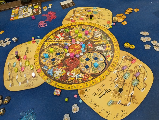 Another gawky procedure is the movement of both cubes and discs on a score track surrounding the instruments. These correspond to player colors, with the disc being placed on the track itself but a player’s cube laying just off the track on the table. The cube must sit next to the space of the track it’s currently occupying, making for a visual jumble and awkward motion at times. It’s also easy to forget to move the disc or cube, as they’re an administrative byproduct. This leads to various points in the game with necessary tallying of areas and re-adjusting the score markers.
