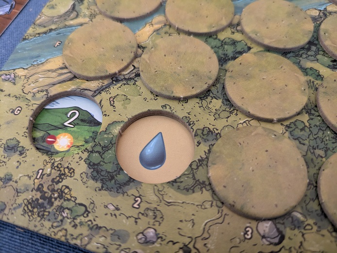 Play is straightforward yet cerebral. On your turn, you select a space to explore and remove the token covering it. The group then receives the resource displayed. Uncover a wooden log and bam, you now have a unit of wood in your collective backpack. Come across a waterdrop and, you’ve guessed it, water. A skull? Not sure exactly what that represents, but you must draw a threat card in addition to gaining the brainplate into your gunny sack.