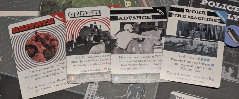 The structure of play is unexpected. In the first phase of the game the mayor’s office and yippies alternate playing action cards until a total of three have been triggered per side. In the following phase, the MOBE and police do the same. This is the implementation of the separation of powers, where the first portion of each round is focused more on setup and maneuvering, with the second resulting in an explosion of violence. This creates a thoughtful slant to the proceedings where you need to carefully consider your options and setup dramatic ploys.
