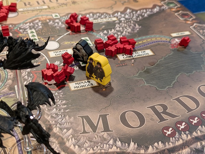 What holds me back from outright praising this schema is the amount of administration involved. You need to look at the drawn card, find where on the board it’s referencing, then move several small stacks of meeples along a path. Sometimes you bump the Nazgul miniatures and create a little chain reaction of displacement that needs to be cleaned up. I wouldn’t call this arduous, but it’s certainly a chore without the promise of an allowance. You also have to do this several times, with the number of Shadow cards increasing over the course of play.