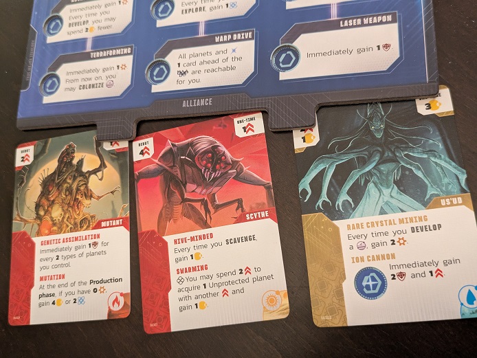 The significance of the three-alliance system is the potency of each faction card. The incremental addition allows them to be slow rolled, kicked on at the appropriate time like afterburners to launch you into the stars. These are wild, game changing abilities. Your first several plays will commonly feature quips like, “wait, you can do that?” and “that seems broken.”