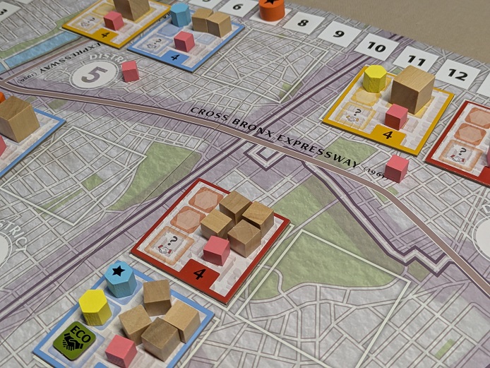 In Cross Bronx Expressway, players control one of three factions. The Public consists of government entities such as law enforcement, firefighters, social workers, and city officials. They are trying to balance the socio-economic interests of the area while protecting the people of the South Bronx from desolation. The Community are local entities such as small businesses, property owners, social clubs, gangs, and nonprofits. They are advocates of the residents and pursue propping up social services and activism. The Private faction encompasses the large business enterprises. Banks, corporations, large-scale property owners. They are playing for the future, maintaining their economic interests while fostering opportunities for future growth. There is incentive to develop zones, form profitable coalitions, and support the life of the South Bronx in accordance with lucrative activities.