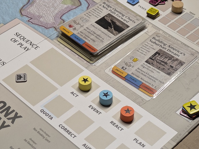 The heart of ICS is a historical event driven system that layers meaning on the situation occurring on the board. Each turn a card is triggered which dictates player activation as well as a unique event that influences play as an expression of historical context. A session is separated across decades in Cross Bronx Expressway, so events include societal inflection points like soldiers returning from World War Two in the 40s, as well as cultural happenings such as Grandmaster Flash and the Furious Five’s single “The Message” which dropped in 1982 and includes harsh commentary on racial tension and socio-economic struggles occurring in the Bronx. Each decade has its own collection of events, and only a random subset is shuffled into the deck. The fact that huge historical occurrences such as the flood of veterans returning from the war is given no more weight than a rap single reveals the game’s underlying cultural motif. This is a game dealing with an enormous amount of social complexity, and it models one of the most severe financial crises in United States history with impressive success.