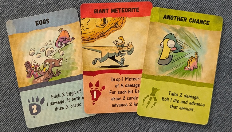 The damage system is kind of interesting. It’s a Gears of War cards as damage mechanism. For every point of damage you receive, you must discard a card from your hand. But it’s random. Yes, allowing players to choose would be worse, but the frequency of damage received in this game means that players are constantly shuffling their hand and having another player pick cards for them to lose. It’s almost exhausting at times. You can see it in the victim’s faces as they let out a sigh and fan their cards out. Often, a player will run through their entire hand and then have to redraw. If one were to describe Dodos Riding Dinos as a game in constant motion, this would be true, but it would be describing the constitution of player’s hands of cards and not the on-track antics.